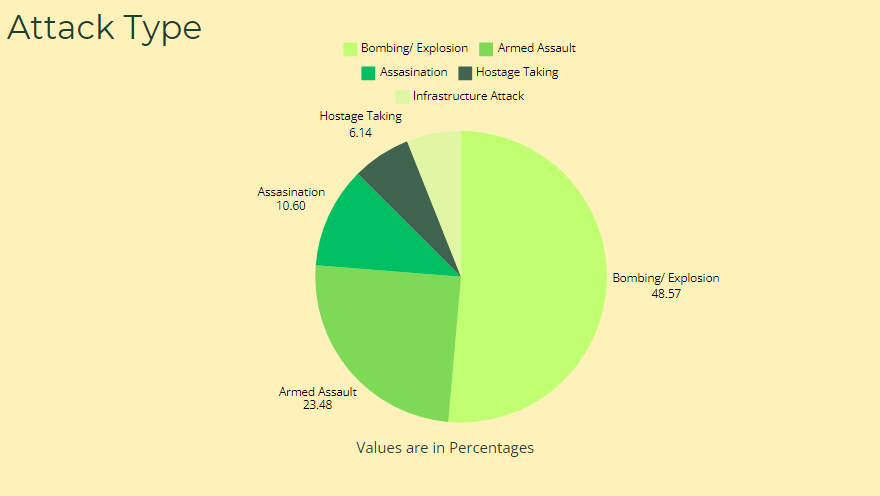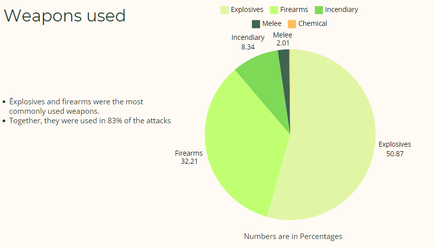 Firearms and Armed Assaults: Similarly, the high percentage of armed assaults (23.5% of attacks) aligns with the frequent use of firearms (32% of attacks). This indicates the continued reliance on conventional weaponry to carry out direct attacks. Strategies to limit access to firearms, strengthen border control to prevent illicit trafficking, and enhance tactical response capabilities to armed assaults are critical components of effective counter-terrorism measures.