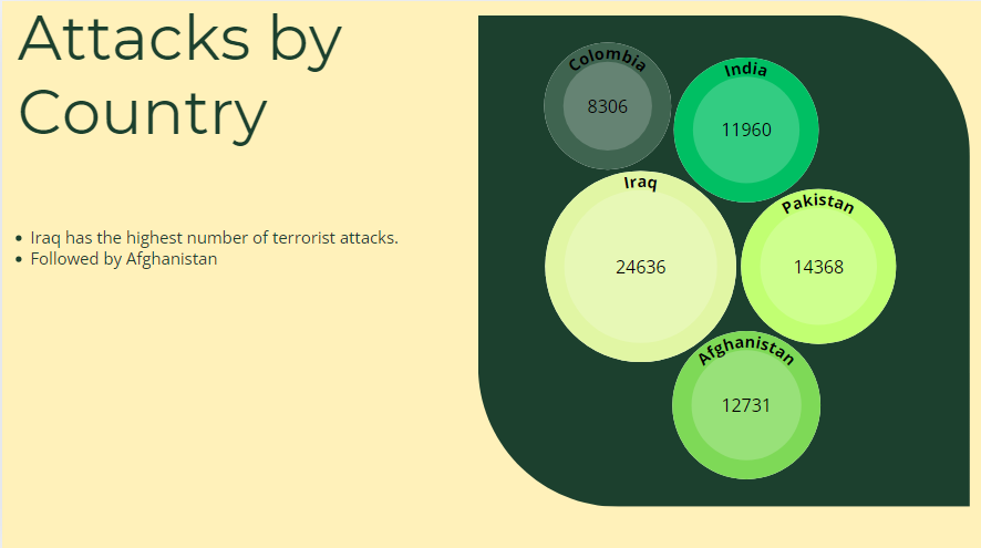 Neighboring Countries: Three of the countries - Iraq, Pakistan, and Afghanistan - share borders, which may indicate a potential spillover effect of terrorist activities across national boundaries.1 This proximity could facilitate the movement of militants, weapons, and resources, making it more challenging to contain terrorism within a single country.