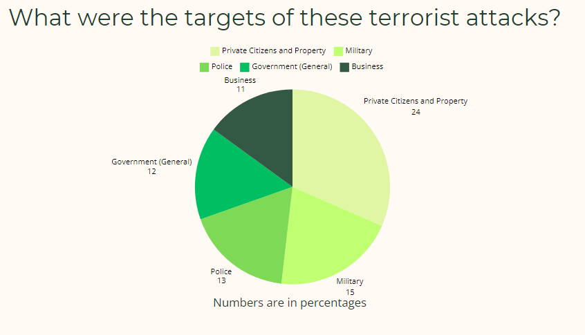 Strategic Targets: Attacks on the military (15%), police (13%), and government (12%) represent a more traditional approach to terrorism, often aimed at weakening state authority and security forces. The significant percentage of attacks on these targets suggests that terrorist groups continue to view them as strategically important